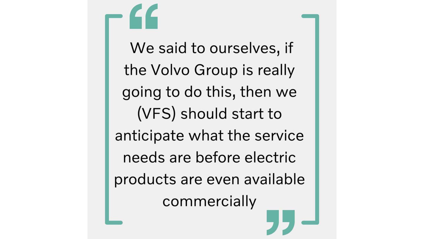 Electrification is such a collaborative effort amongst all the Volvo Group brands. These are new products with so many capabilities required to offer a total solution, and it really is all hands and minds on deck. Our innovation team is a key player here. Having dedicated resources to electrification who think creatively about what role a finance company plays in the larger arena of electrification services is essential. Thinking creatively means providing something completely different than what we have traditionally and building a business model that spans multiple owners across the product lifecycle. With the creation of a dedicated electromobility services team in VFS, we are well positioned to scale these early developments.